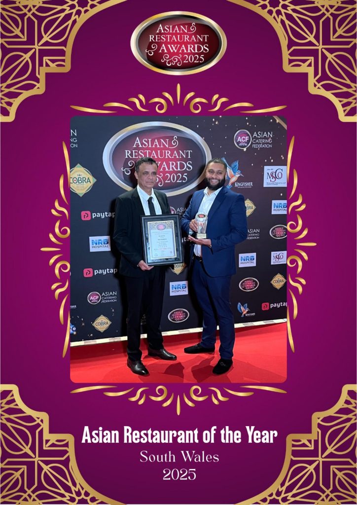 Here we are holding the Asian Restaurant of the Year – South Wales award, from the Asian Restaurant Awards 2025.